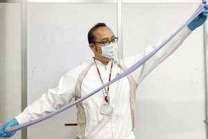 「写真は飴作りの製菓技術のひとつであるプリング(引き飴)という技術を活かし、ハイチュウの特徴的な食感である、もちもち&びよ~んと伸びる物性をインパクトあるかたちでお伝えできるように開発したパフォーマンスの一つです。(ただの遊びではありません!)」